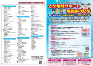 とめ地域サポート商品券は令和8年3月1日(日)から下記、取扱店一覧チラシへ掲載の取扱店でご利用いただけます。